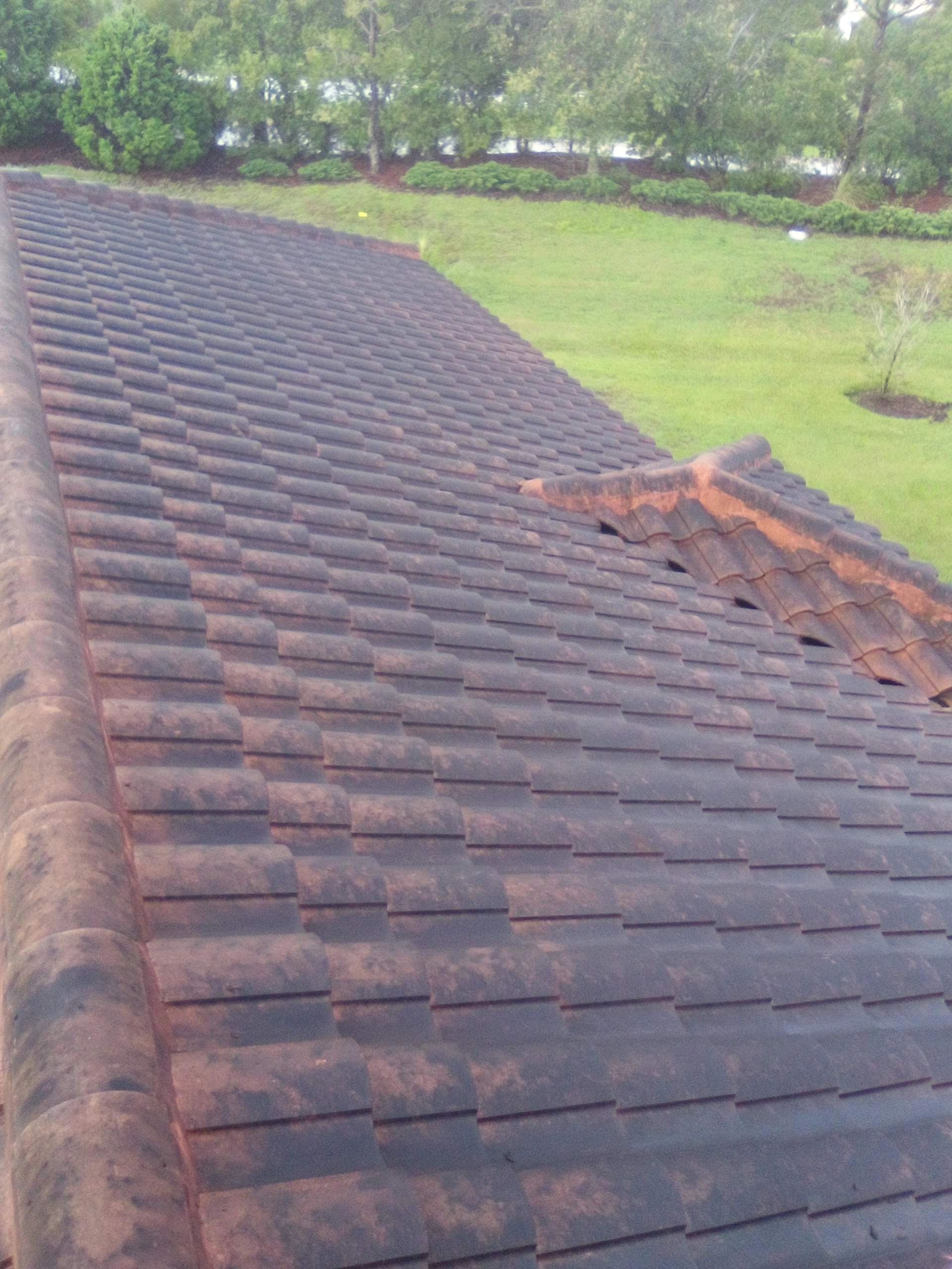 We then use a commercial pressure washer with a special designed surface cleaner for roofs. This is nessary to remove all the organic materials from the tile. This process uses 100% water to clean.